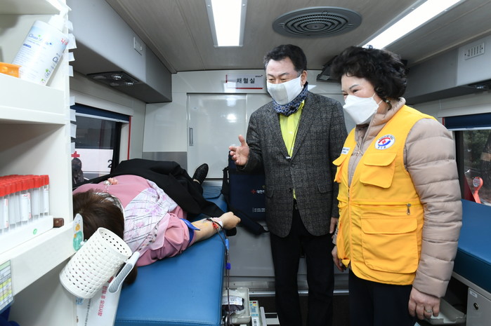경기 구리시는 최근 대한적십자사봉사회 구리지구협의회와 대한적십자사 서울동부혈액원 지원으로 2022년 첫 번째 ‘공직자와 함께하는 행복나눔 헌혈행사’를 개최했다. 사진은 안승남 시장(가운데)이 헌혈에 참가한 직원을 격려하고 있는 모습. (사진제공=구리시청)
