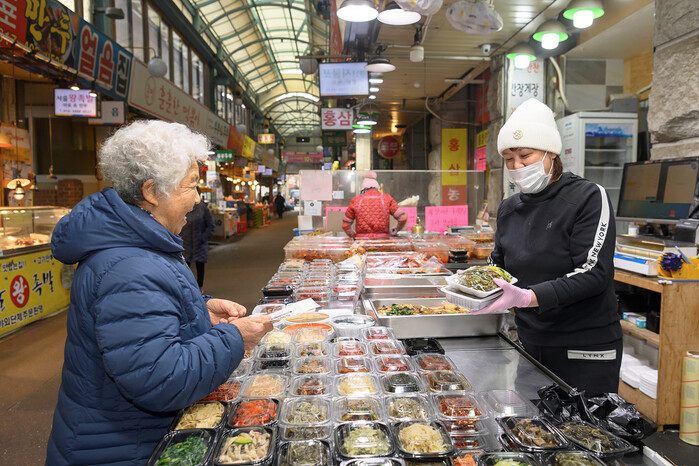 | ▲ 양천구에서 제공받은 이용권으로 반찬가게를 찾아 밑반찬을 구매하는 구민 모습. (사진=양천구청 제공) |