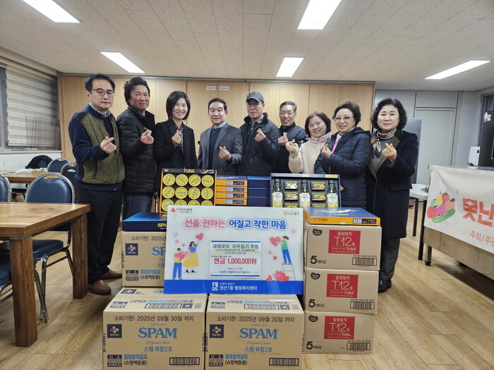 경기 수원시 권선구 권선1동행정복지센터는 13일 새해를 맞아 어려운 이웃들에게 전달해 달라며 각 단체장들로부터 햄, 참치 선물세트 37상자 등 100만원에 달하는 후원품을 전달받았다. 기탁받은 물품은 권선1동의 형편이 어려운 다자녀 가구에 전달될 예정이다. 사진은 기탁식에서 관계자드이 기념촬영을 하고 있는 모습. (사진=수원시청 제공)