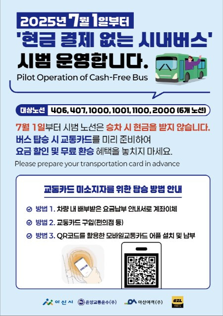 [아산=박명수 기자] 충남 아산시가 오는 7월1일부터 12월까지 6개월 동안 일부 시내버스 노선에서 '현금결제 없는 시내버스'를 시범 운영한다.
