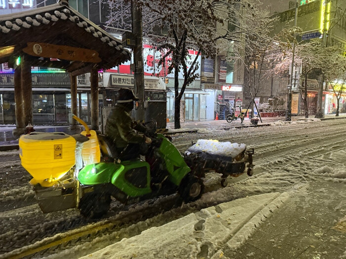 [시민일보 = 이대우 기자] 서울 종로구(구청장 정문헌)가 기록적인 폭설로부터 시민 안전을 지키기 위해 다양한 제설장비를 투입하는 등 제설 총력전을 펼치고 있다.
