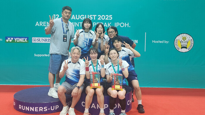 | ▲ ‘2025 말레이시아 국제 배드민턴 챌린지’에서 여자 복식 부문 우승을 차지한 구로구청 배드민턴 팀이 시상식 후 단체 기념 촬영을 하고 있다. (사진=구로구청 제공) |