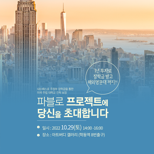 이번 세미나는 오는 29일 토요일 오후 2시에 학동역 아트버디 갤럴리에서 진행되며, “파블로에듀”홈페이지 세미나 사전 예약자에게는 설명자료 및 이상명 글로벌인재전문가님의 밀착 상담 등 다양한 혜택을 제공할 예정이다.