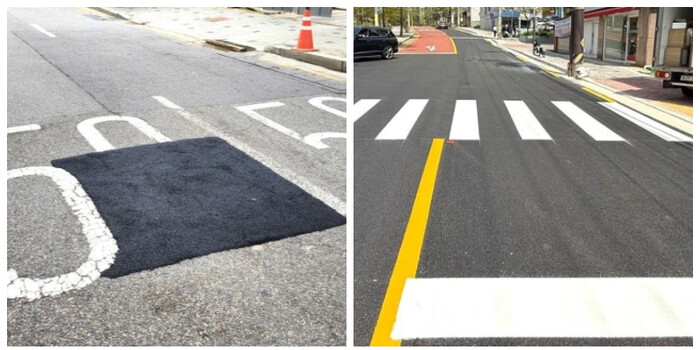 | ▲ (왼쪽) 도로 파임 정비 모습, (오른쪽) 노후 도로 정비 모습.(사진=영등포구청 제공) |