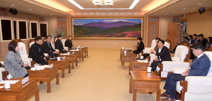 ▲ 강기정 광주광역시장(오른 쪽부터 두 번쨰)가 지난 1월23일 시청 비즈니스룸에서 제주항공 여객기 참사 이후 어려움을 겪고 있는 관광업계 애로사항 청취를 위해 지역 관광업계와 간담회를주재 하고 있다. /광주광역시 제공 |