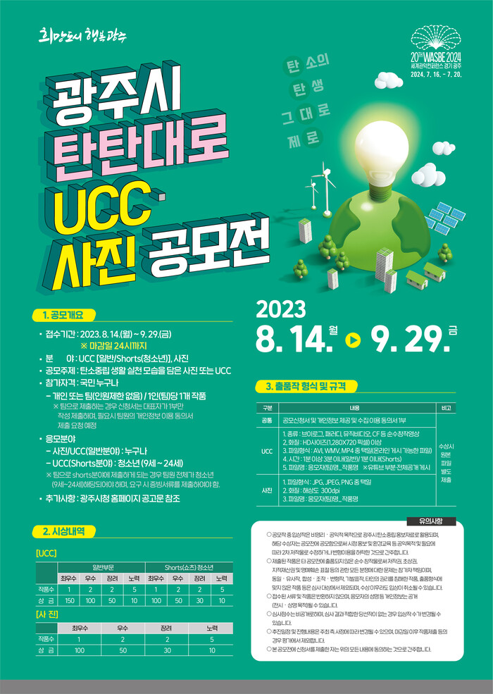 탄소중립에 대한 시민의 관심과 생활 속 실천 유도를 위한 이번 공모전은 ‘광주시 탄탄대로’란 주제로 광주시의 지역 특수성 및 상징성을 반영한 생활 속 탄소중립 실천 방안에 대해 UCC 또는 사진으로 제출하면 된다.
