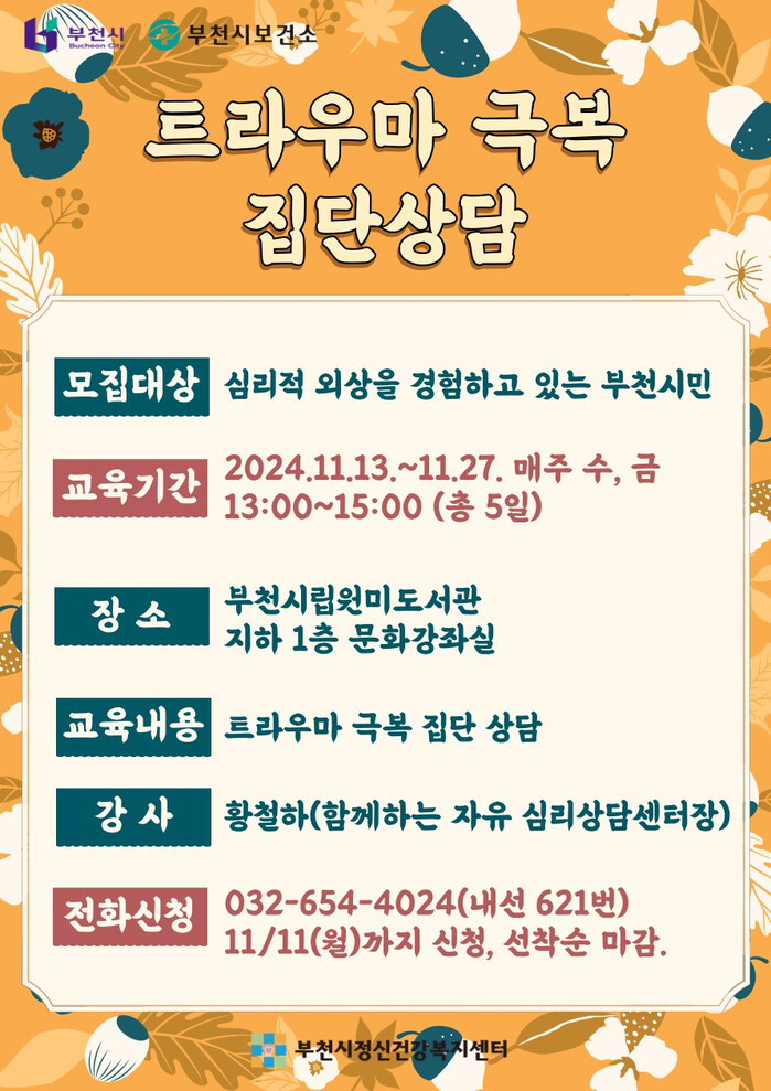 [부천=문찬식 기자] 경기 부천시와 부천시정신건강복지센터는 심리적 외상을 경험하는 부천시민들의 일상 회복을 위해 오는 11월13일부터 27일까지 ‘트라우마 극복 집단상담’을 운영한다.