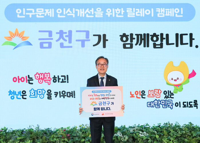 유성훈 금천구청장이 지난 13일 저출생과 고령화 등 인구문제에 대한 사회적 공감대를 확산하고자 보건복지부와 한국보건복지인재원이 공동으로 추진하는 ‘인구문제 인식 개선 릴레이 캠페인’에 참여했다. 정용래 대전시 유성구청장의 지목을 받아 캠페인에 동참한 유 구청장은 다음 캠페인 참여자로 장인홍 구로구청장, 양승호 금천경찰서장을 지목했다. 사진은 캠페인에 참여한 유 구청장의 모습. (사진=금천구청 제공)