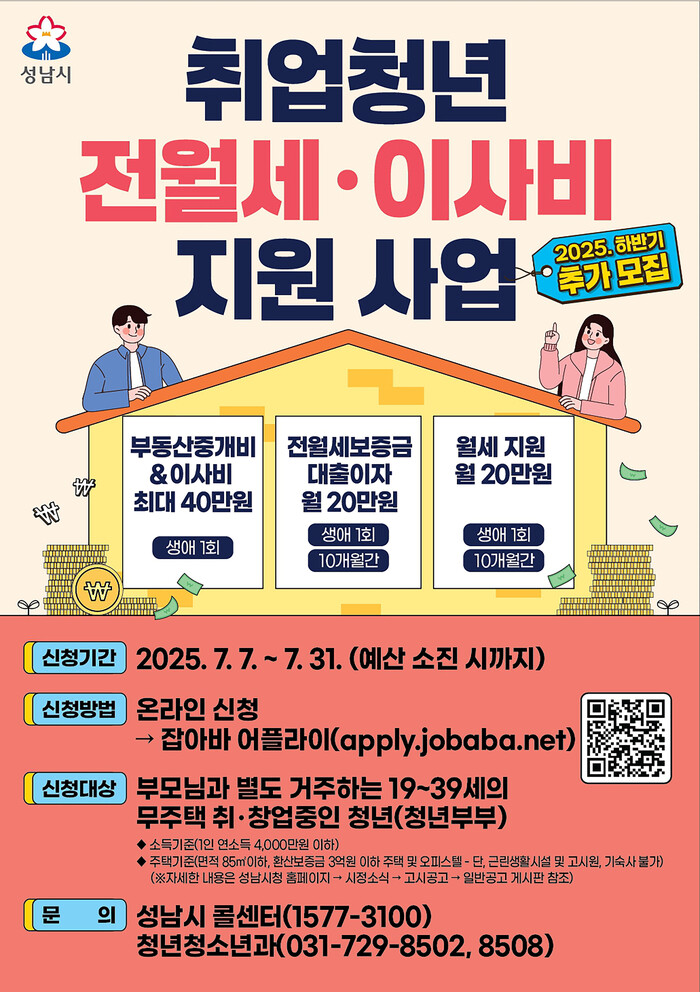 [성남=오왕석 기자] 성남시(시장 신상진)는 오는 7월 31일까지 ‘취업 청년 전월세·이사비 지원사업’ 참여 희망자 625명을 추가 모집한다.