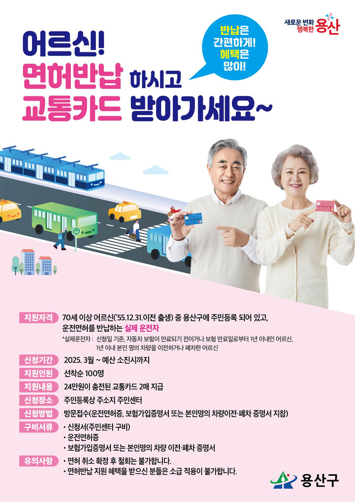 [시민일보 = 문민호 기자] 서울 용산구(구청장 박희영)는 오는 3월부터 70세(1956년 이전 출생) 이상 실제 운전자가 운전면허를 반납하면 최대 68만원이 충전된 교통카드를 지원하는 사업을 시행한다고 26일 밝혔다