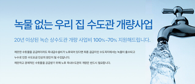 지원 대상은 녹물 발생이나 수압 저하로 불편을 겪는 가구 가운데 ▲사용승인일로부터 20년 이상 경과한 단독주택·다가구주택·공동주택 ▲연면적 130㎡ 이하 주택 요건을 모두 충족해야 한다. 다만, 최근 5년 이내 동일 사업의 지원을 받은 주택이나 재개발·재건축·리모델링 등 사업 인가를 받은 주택은 대상에서 제외된다.