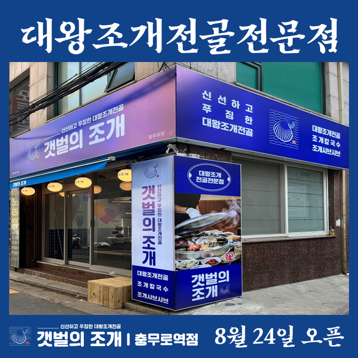 대왕조개전골 육수는 해물맛과 얼큰맛으로 나눠 판매하고 있어 취향에 따른 선택이 가능하며, 라면사리나 칼국수면 등을 넣어 먹을 수도 있다. 점심특선으로 칼국수+육전 세트도 판매하고 있어 가족외식과 모임장소로도 인기가 많다.