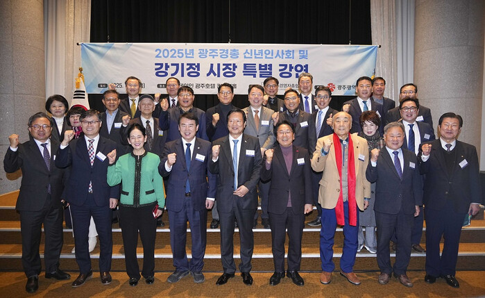 [광주=정찬남 기자] 강기정 광주광역시장(앞줄 오른 쪽부터 네 번째)이 24일 오전 서구 홀리데이인호텔에서 열린 광주경영자총협회 금요조찬포럼에 참석해 시정운영 방향을 공유한 뒤 기념촬영을 하고 있다./광주광역시 제공