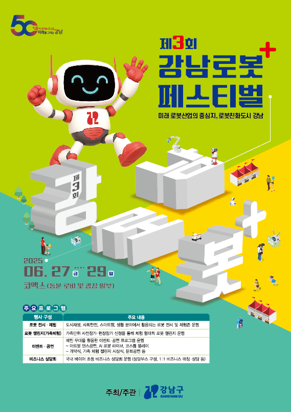 [시민일보 = 이대우 기자] 강남구(구청장 조성명)가 오는 27~29일 코엑스 1층 동문 로비와 야외 광장에서 ‘제3회 강남 로봇플러스 페스티벌’을 개최한다.