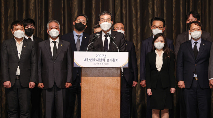 | ▲ 이종엽 대한변호사협회 회장을 비롯한 대한변협 소속 변호사들이 25일 오전 서울 중구 롯데호텔 본점에서 정기총회 전 가진 기자회견에서 국회에서 추진 중인 '검수완박' 국회의장 중재안에 대한 성명을 발표하고 있다. (사진제공= 연합뉴스) |