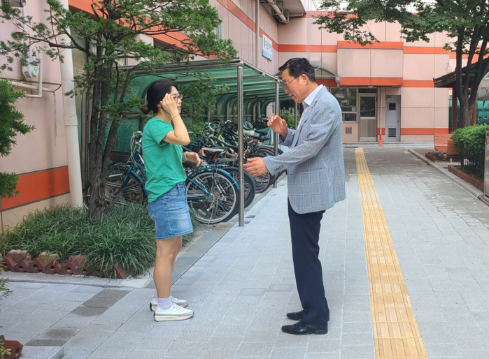| ▲ 최근 암사동 대원아파트 공동주택지원사업 현장을 방문한 한진수 의원이 공사가 완료된 보도블럭 및 경계석 현장을 점검하며 주민과 이야기 나누고 있다.(사진=한진수 의원 제공) |