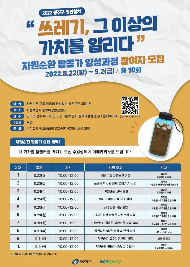 구 관계자는 “이번 과정을 통해 역량 있는 주민 활동가를 배출하고, 생활 속에서 자원순환을 실천하는 문화가 확산되기를 바란다”라며 “주민이 주도하는 자원순환 도시를 실현할 수 있도록 많은 참여를 바란다”라고 말했다.
