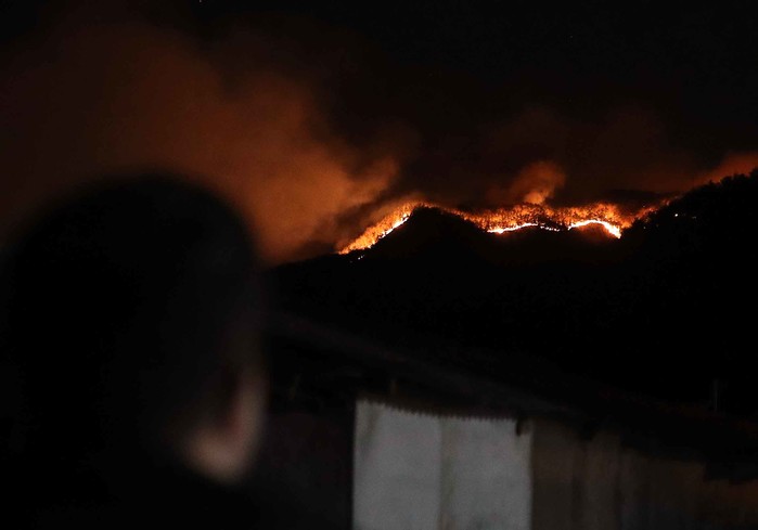 정상 부근에서 시작된 불길은 남서풍을 타고 북동쪽으로 이동하며 도(道) 경계를 넘어 인접한 경북 고령군 쌍림면 신촌리까지 확산했다. 사진은 이날 오후 10시 50분께 합천군 산불 현장.