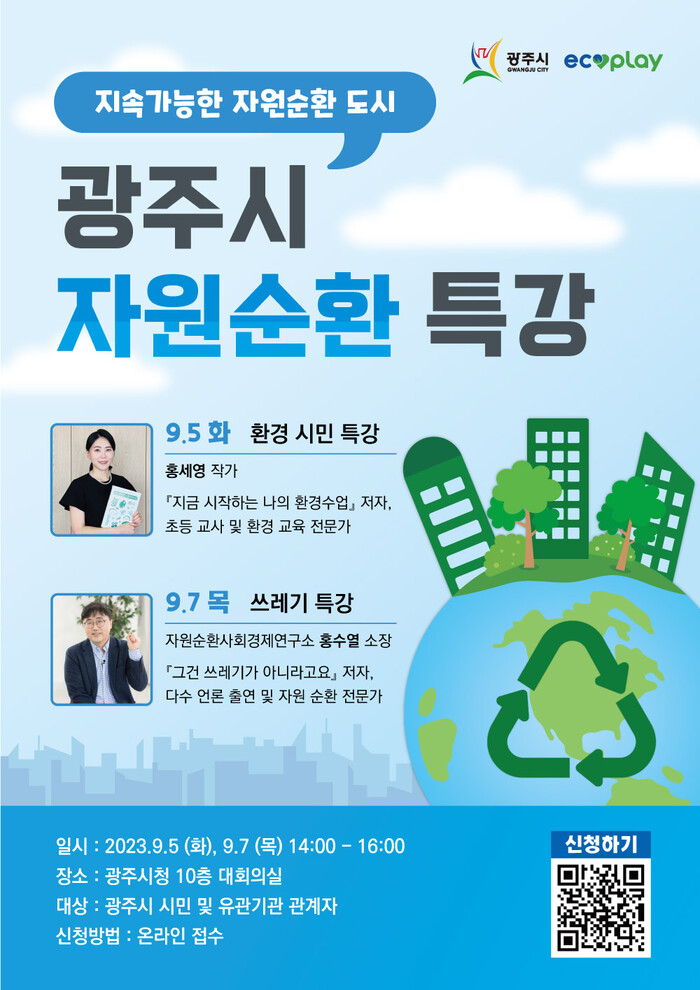 시청 대회의실에서 진행되는 이번 특강은 2023년 자원순환활동가 양성교육 과정과 연계해 진행하며 참여 신청은 특강 모집 포스터의 QR코드를 통해 할 수 있다. 특강 모집 포스터는 광주시청 홈페이지→광주소식→알림마당→새소식→2023년도 광주시 ‘자원순환 특강’ 실시 게시글을 통해서 확인할 수 있으며 각각 250명 선착순 모집한다.