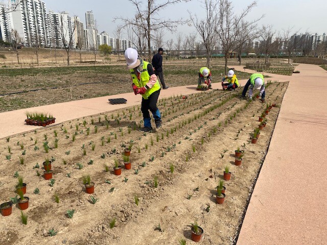 | ▲ 안양천 생태초화원에 모종을 심고 있다. (사진= 구로구청 제공) |