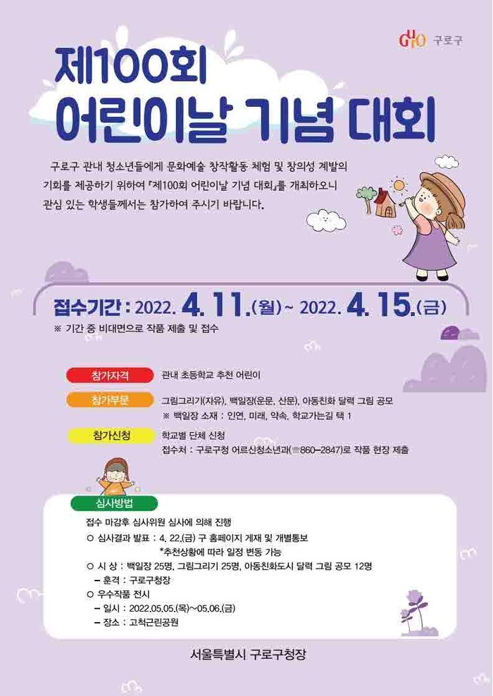 [시민일보 = 박준우 기자] 서울 구로구(구청장 이성)가 제100회 어린이날을 맞아 오는 11일부터 15일까지 비대면 행사를 개최한다.