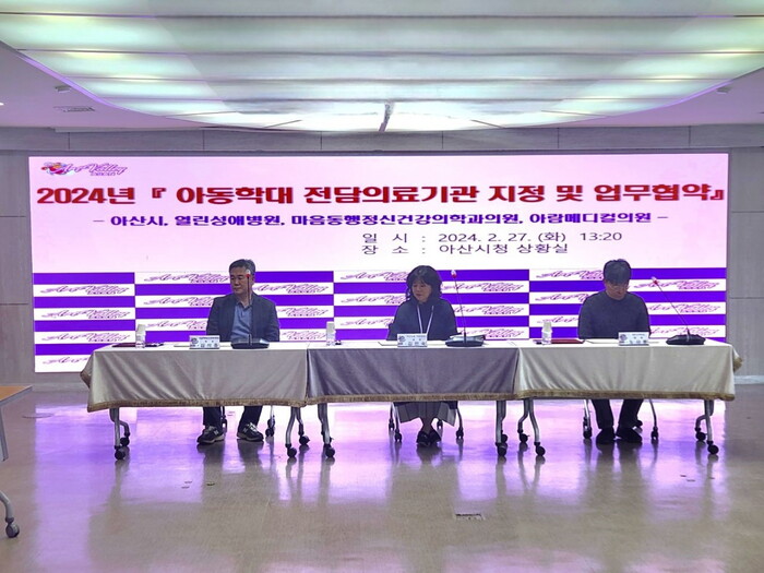 [아산=박명수 기자] 충남 아산시가 27일 아산시청에서 열린성애병원, 마음동행정신건강의학과의원, 아람메디컬의원을 아동학대 전담의료기관으로 지정하고 업무 협약을 체결했다.