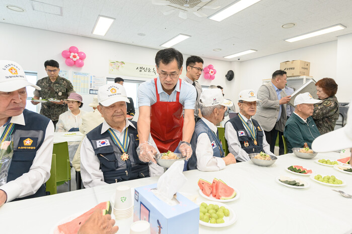이기재 서울 양천구청장이 최근 양천구 여성 예비군이 주관하고 7688-3 부대가 주최한 ‘6.25 참전용사 점심 대접’ 행사에 참여해 따뜻한 마음을 나눴다. 사진은 행사에서 이 구청장이 점심을 배식하는 모습. (사진=양천구청 제공)