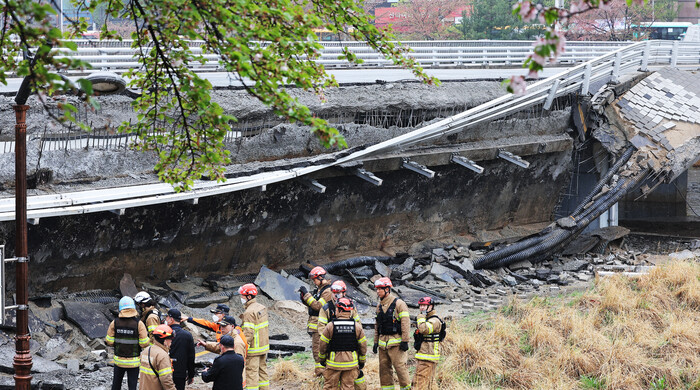 | ▲ 5일 오전 교량 양쪽에 설치된 보행로 중 한쪽 보행로가 갑자기 무너져 내리며 1명이 숨지고 1명이 다치는 사고가 발생한 경기도 성남시 정자교에서 소방 등 관계자들이 분주하게 움직이고 있다. (사진=연합뉴스 제공) |