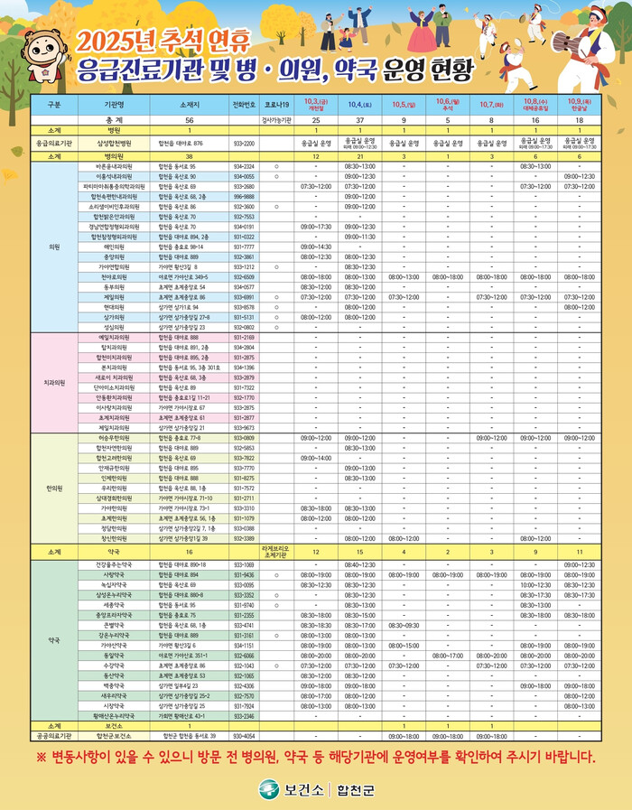 연휴 기간 동안 합천군은 보건소에 응급진료상황실을 운영하며, 오전 9시부터 오후 6시까지 근무하고 이후 시간에는 비상 연락망을 유지해 응급 상황에 신속히 대응할 계획이다. 상황실은 응급진료기관의 운영 현황을 점검하고, 응급환자 비상진료기관 안내, 감염병 발생 모니터링 등을 담당한다.