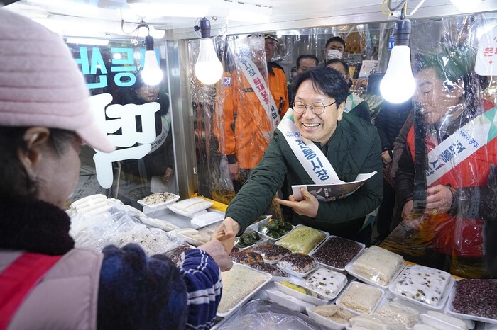 | ▲ 강기정 광주광역시장이 지난해 2월 6일 동구 대인시장을 방문해 상인들을 격려하며 전통시장 화재공제 가입 캠페인을 벌이고 있다./ 자료사진 = 광주광역시 제공 |