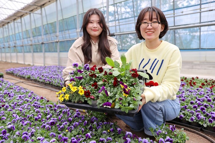| ▲ 해남군 농업기술센터 직원들이 센터 내 육묘장에서 재배한 다양한 봄꽃을 소개하고 있다. / 해남군 제공 |