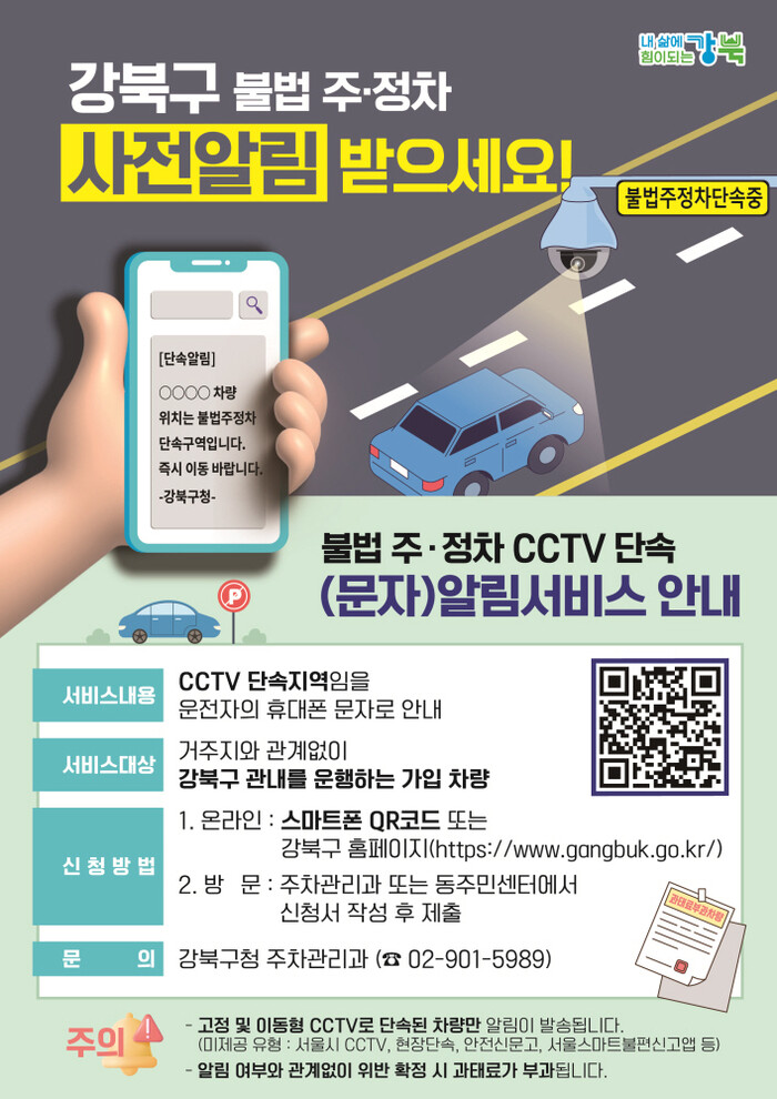 [시민일보 = 문민호 기자] 서울 강북구(구청장 이순희)는 불법 주·정차 예방을 위해 CCTV 단속 알림서비스를 시행한다고 19일 밝혔다.