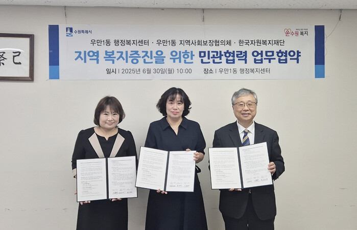 경기 수원시 팔달구 우만1동 행정복지센터가 최근 지역내 복지사각지대 해소와 통합적 복지지원체계 강화를 위해 한국자원복지재단, 우만1동 지역사회보장협의체와 업무협약을 체결했다. 사진은 업무협약식에 참석한 관계자들이 기념촬영을 하고 있는 모습. (사진=팔달구청 제공)