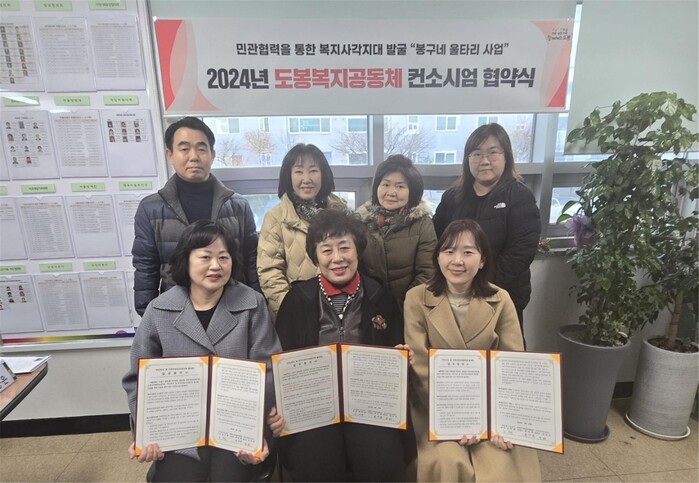서울 도봉구 쌍문4동은 최근 쌍문4동지역사회보장협의체, 도봉구치매안심센터와 복지공동체 컨소시엄 협약을 체결했다. 협약에 따라 협약 주체들은 동단위 복지기획단을 운영하고 민·관이 함께 참여하고 협력하는 ‘주민주도 복지사업’을 펼쳐나갈 예정이다. 사진은 협약식에서 관계자들이 기념촬영을 하고 있는 모습. (사진=도봉구청 제공)