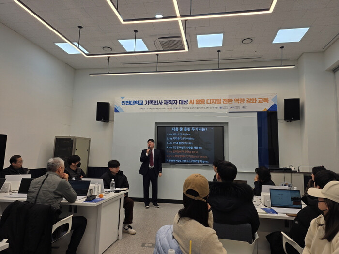 | 인천대 산학협력단이 ‘가족회사 재직자 대상 AI 활용 디지털 전환 역량 강화 교육’을 하고 있다. [사진=인천대] |