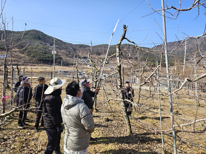 이번 교육은 품목별 농업인연구회 육성 사업의 일환으로, 겨울철 전정 작업을 통해 수세 안정과 결실 품질을 높이고 이상기후에 대응할 수 있는 현장 적용 중심의 영농기술을 보급하기 위해 마련됐다.