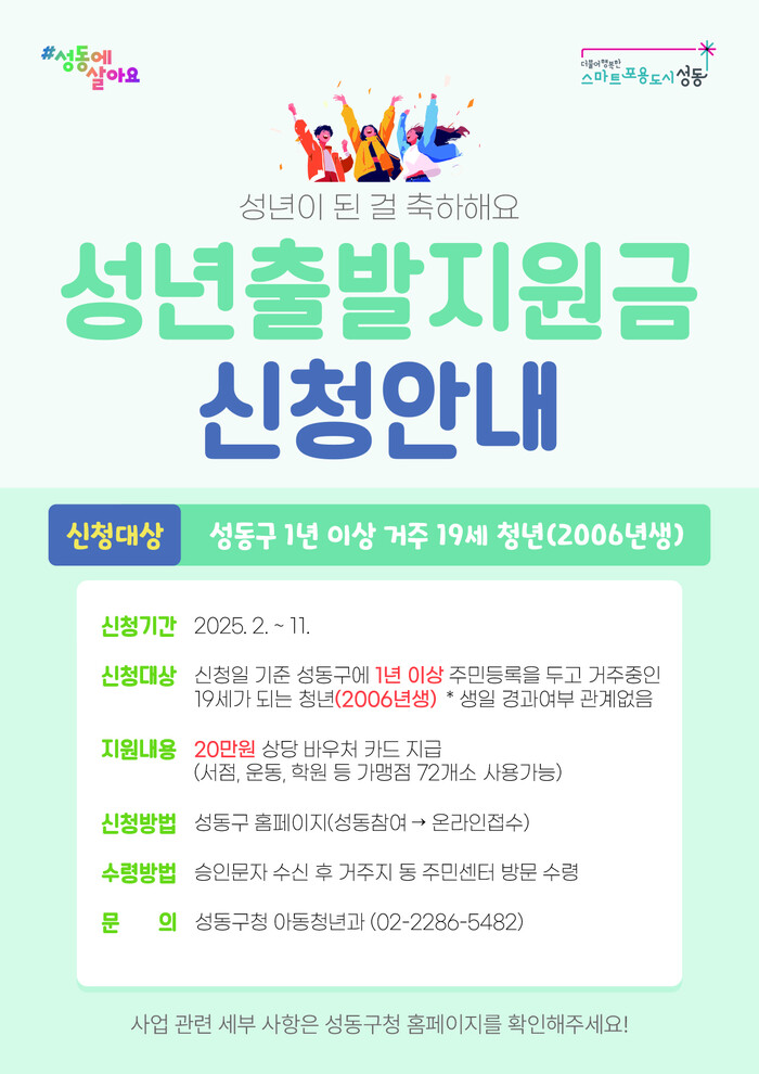 [시민일보 = 박소진 기자] 서울 성동구(구청장 정원오)가 사회에 첫발을 내딛는 청년들을 대상으로 ‘성년출발지원금’을 지원한다고 28일 밝혔다.