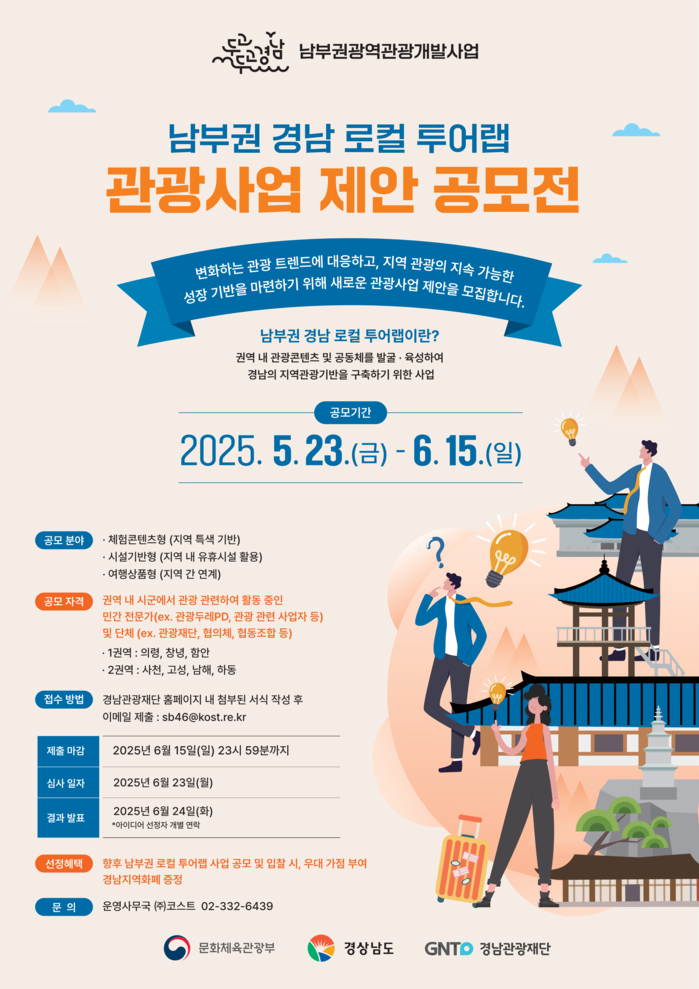 공모전 참여를 원하는 지역 중간조직은 오는 6월15일까지 경남관광재단 홈페이지에서 신청 양식을 다운로드하여 작성한 뒤 이메일로 제출하면 된다.