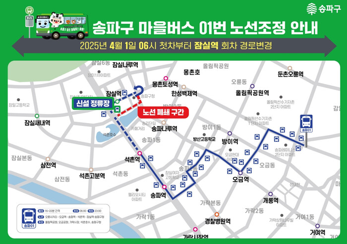 [시민일보 = 이대우 기자] 서울 송파구(구청장 서강석)가 구민들의 교통편의 증진을 위해 1일부터 마을버스 송파 01번 노선을 조정해 운행에 들어갔다.