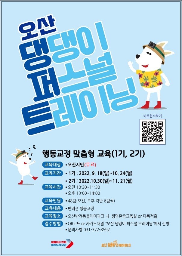 반려견과 생활하는 오산시민 누구나 참여할 수 있으며, 홍보 전단지의 QR코드를 이용하거나 카카오채널 '오산 댕댕이 퍼스널 트레이닝'에서 신청하면 된다.