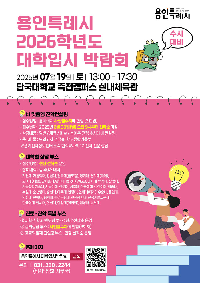 [용인=오왕석 기자] 용인특례시(시장 이상일)는 7월 19일 오후 1시부터 5시 30분까지 단국대학교 죽전캠퍼스 실내체육관에서 ‘2026학년도 수시대비 대학입시박람회’를 개최한다고 25일 밝혔다.
