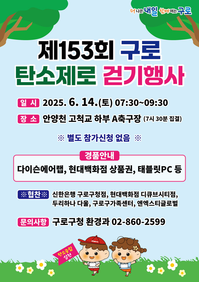 [시민일보 = 박소진 기자] 서울 구로구(구청장 장인홍)가 오는 14일 안양천 고척교 하부 A축구장에서 ‘제153회 구로 탄소제로 걷기 행사’를 개최한다.
