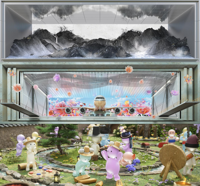'인천공항의 여정'은 리얼한 공항의 공간과 초현실적 자연의 대비적 연출을 통해 여행을 떠나는 여정의 즐거움과 설렘을 경쾌하게 표현한 작품이다. 초현실적 공항 공간연출과 아나몰픽 기법을 활용해 여행의 기쁨과 만남의 설렘을 입체적인 비행기와 함께 연출한다.