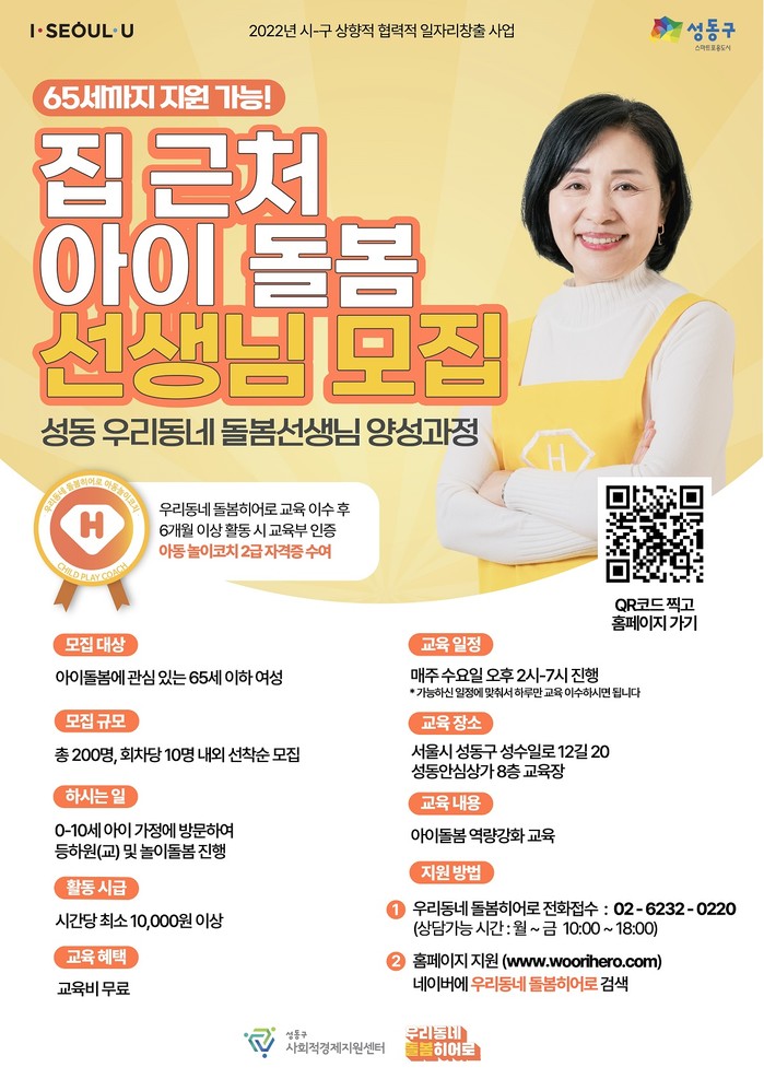 [시민일보 = 홍덕표 기자] 서울 성동구(구청장 정원오)가 지역내 육아 가정의 아이돌봄 공백을 해소하고 중장년 여성의 일자리 창출을 위해 '성동 우리동네 돌봄선생님'을 상시 모집하고 있다.