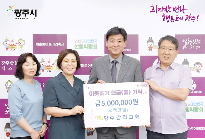 기독교 대한감리회 광주교회 최종호 담임목사가 최근 경기 광주시청을 방문해 지역내 취약계층을 위한 이웃돕기 성금 500만원을 기탁했다. 사진은 기탁식에서 방세환 시장(오른쪽 두 번째)이 관계자들과 기념 촬영을 하는 모습. (사진=광주시청 제공)