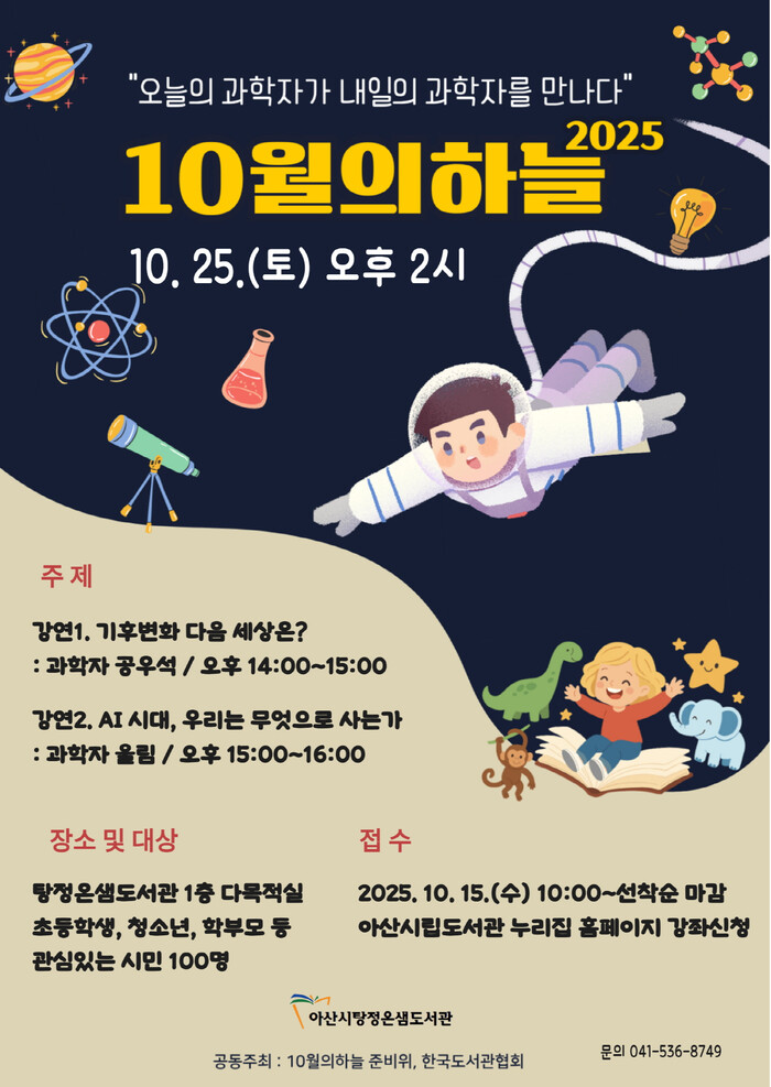 [아산=박명수 기자] 충남 아산시가 오는 25일 탕정온샘도서관과 꿈샘어린이청소년도서관에서 ‘10월의 하늘’ 과학 강연을 개최한다고 밝혔다.