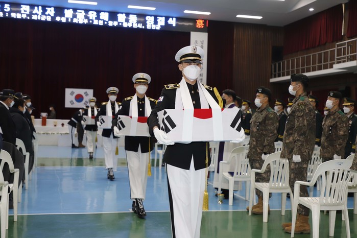 육군 6군단은 최근 경기 포천시 군단 사령부에서 6.25 전사자 발굴유해 합동 영결식을 열었다. 6군단은 유해발굴 감식단과 지난 4~11월 비무장지대내 화살머리고지 등에서 87구의 유해와 2만9017점의 유품을 발굴했으며, 이 중 6.25전쟁 당시 고지전이 벌어진 백마고지 일대에서 발견한 유해는 총 22구에 달한다. 사진은 이날 영결식이 진행되고 있는 모습. (사진제공=포천시청)
