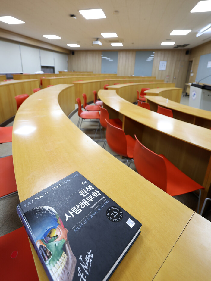 15일 강원 춘천시 한림대학교 의과대학의 빈 강의실에 해부학 교재가 놓여 있다.