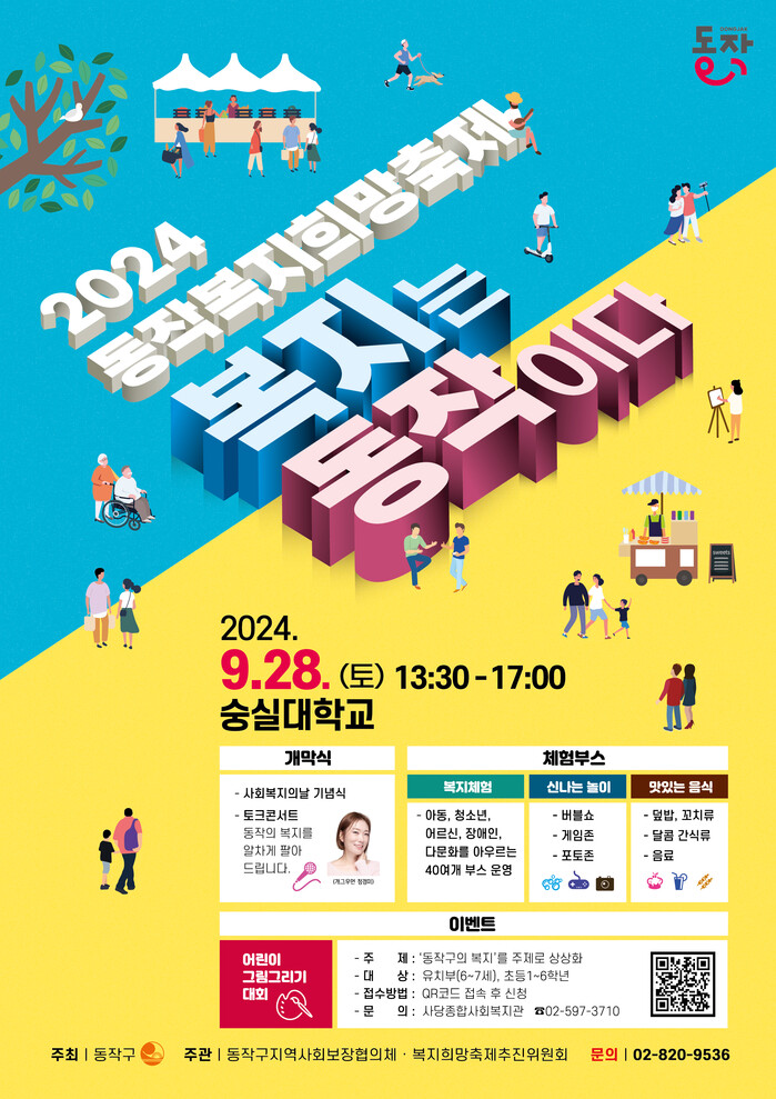 [시민일보 = 여영준 기자] 서울 동작구(구청장 박일하)는 사회복지의 날(9월7일)을 기념해 오는 28일 숭실대학교에서 지역내 40여개 사회복지 유관기관과 함께하는 ‘2024 동작복지희망축제’를 개최한다고 밝혔다.