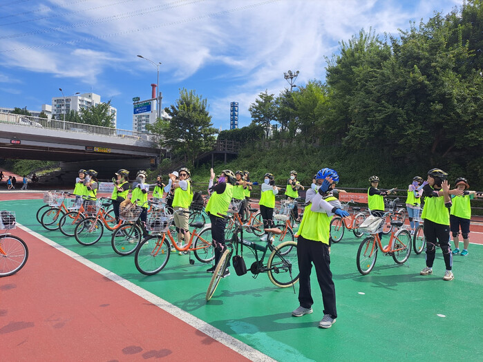 | ▲ 노원구 자전거교실 주민들의 준비 운동 모습. (사진=노원구청 제공) |
